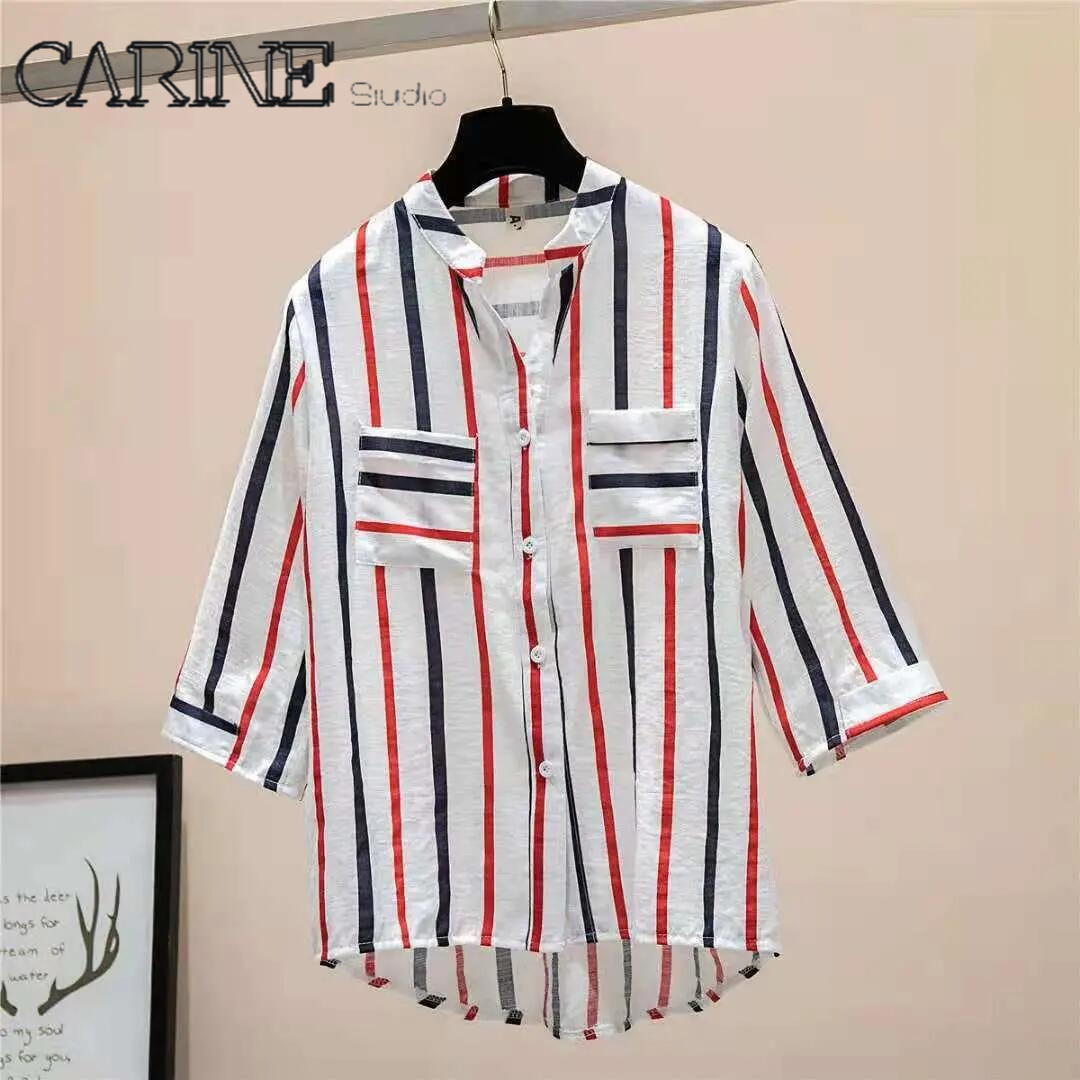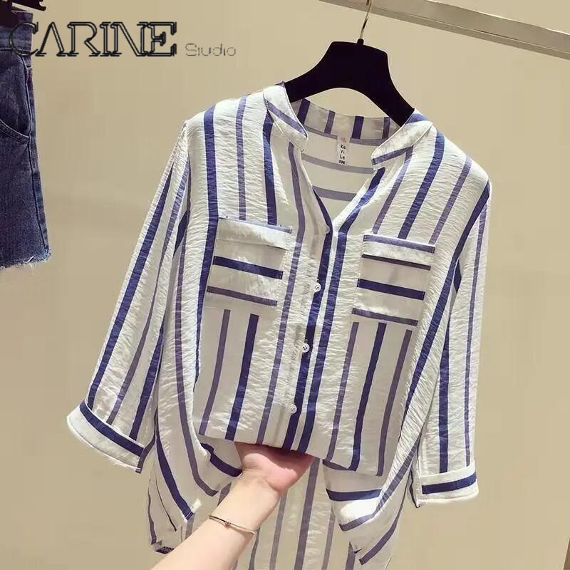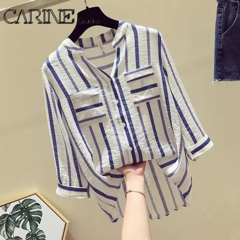 CARINE 2021 New Striped Korean Long sleeves Blouse Large size V collar Women Top
