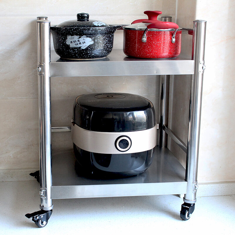 Stainless Steel Kitchen Rack with Wheels Two-Layer Fence Microwave Oven Rack Pot Rack Seasoning Rack Floor Storage Rack