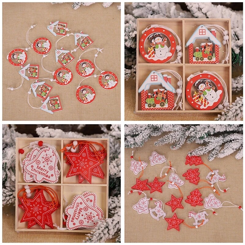 12pcs/lot Christmas Tree Ornament Wooden Snowflake Hanging Pendants Xmas Decoration For Home New Year Kids Gifts Party Favors