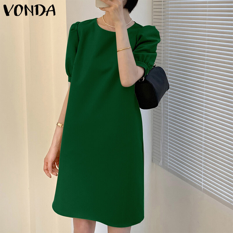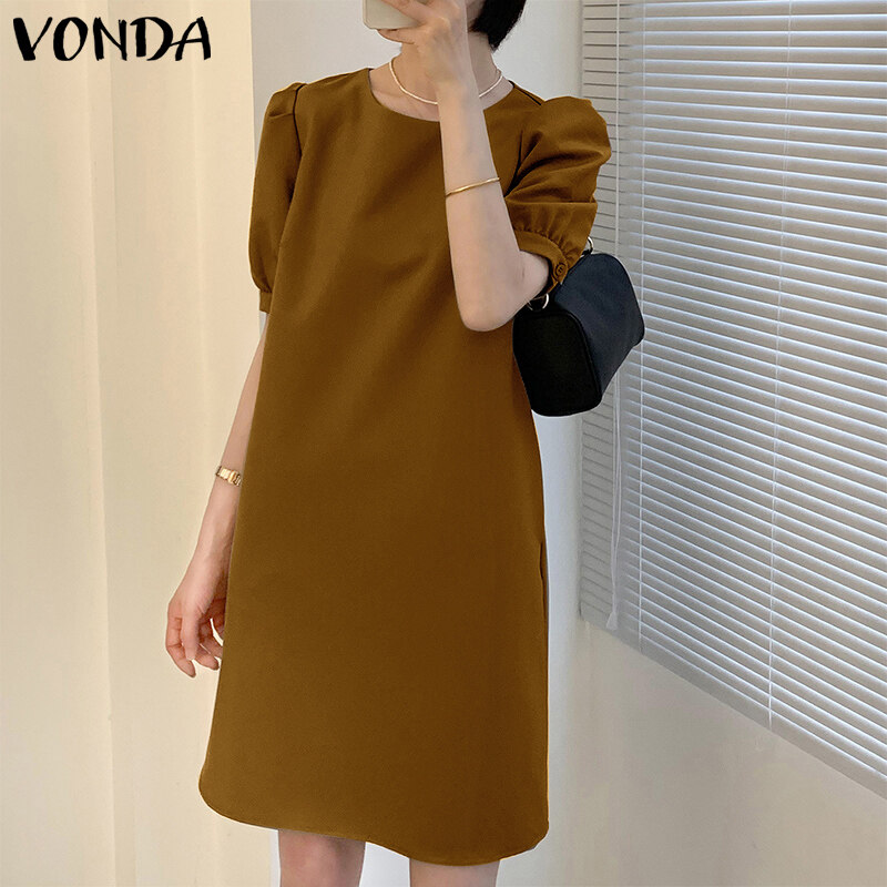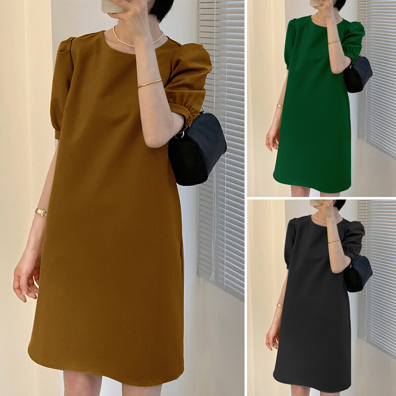 VONDA Women Summer Solid Color O Neck Casual Loose Knee-length T-shirt Dress (Korean Causal)