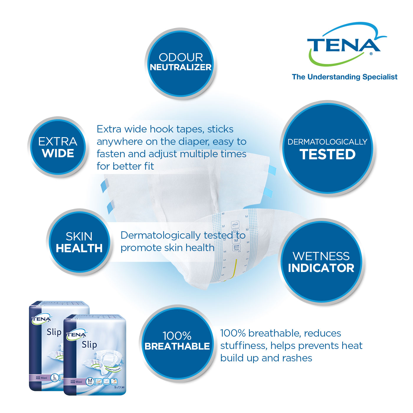 TENA Slip Maxi is an open all-in-one incontinence product with adjustable tabs for perfect fit, comfort and leakage protection. Unlike many standard adult diapers, TENA ProSkin Slip have soft textile-like material, a body-close fit and high leakage security and are ideal for someone less mobile or when changing in bed. Thanks to the FeelDry Advanced™ functionality the product quickly