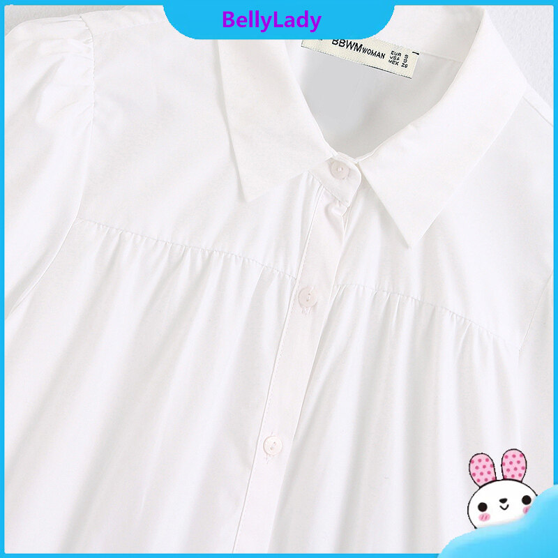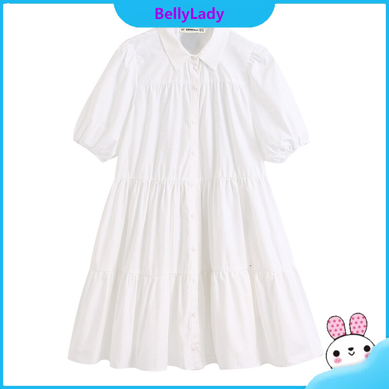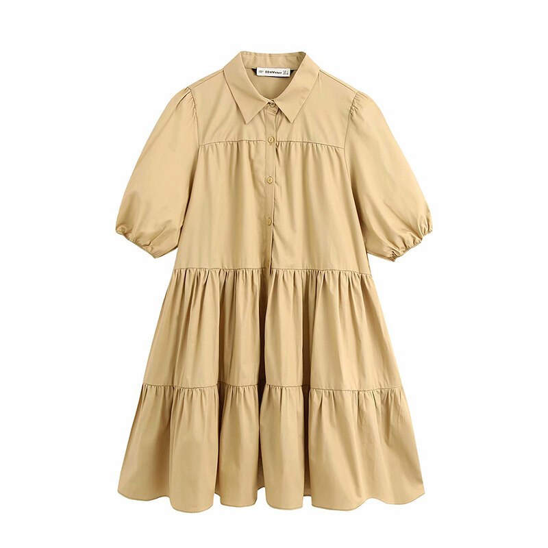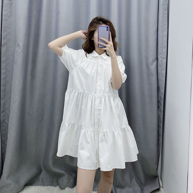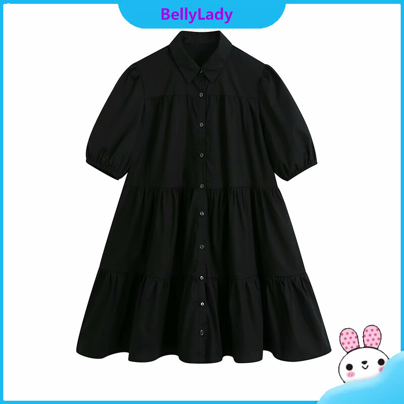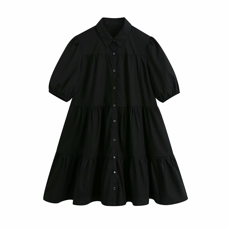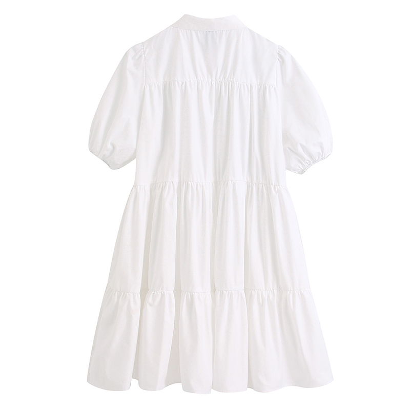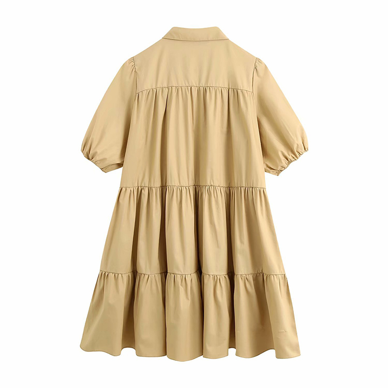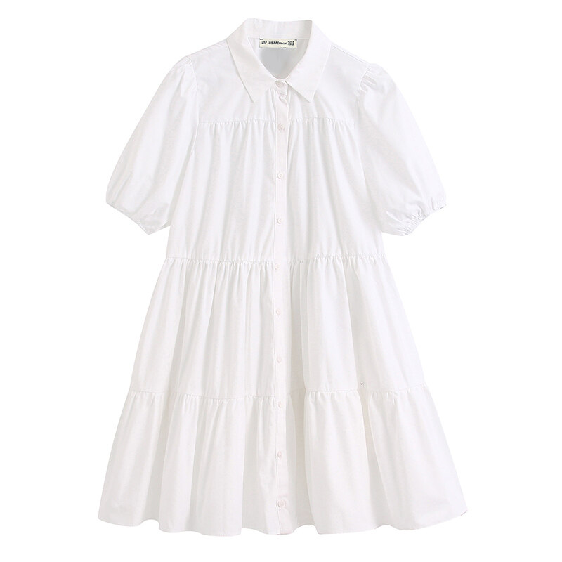 Women Fashion Lapel Dress Single-breasted Solid Color Puff Sleeves Skirt Short Sleeves Loose Dress