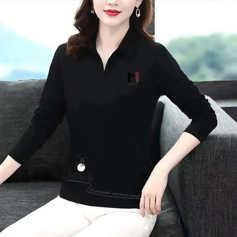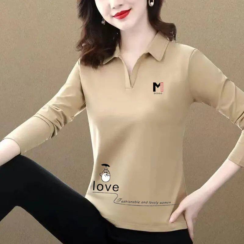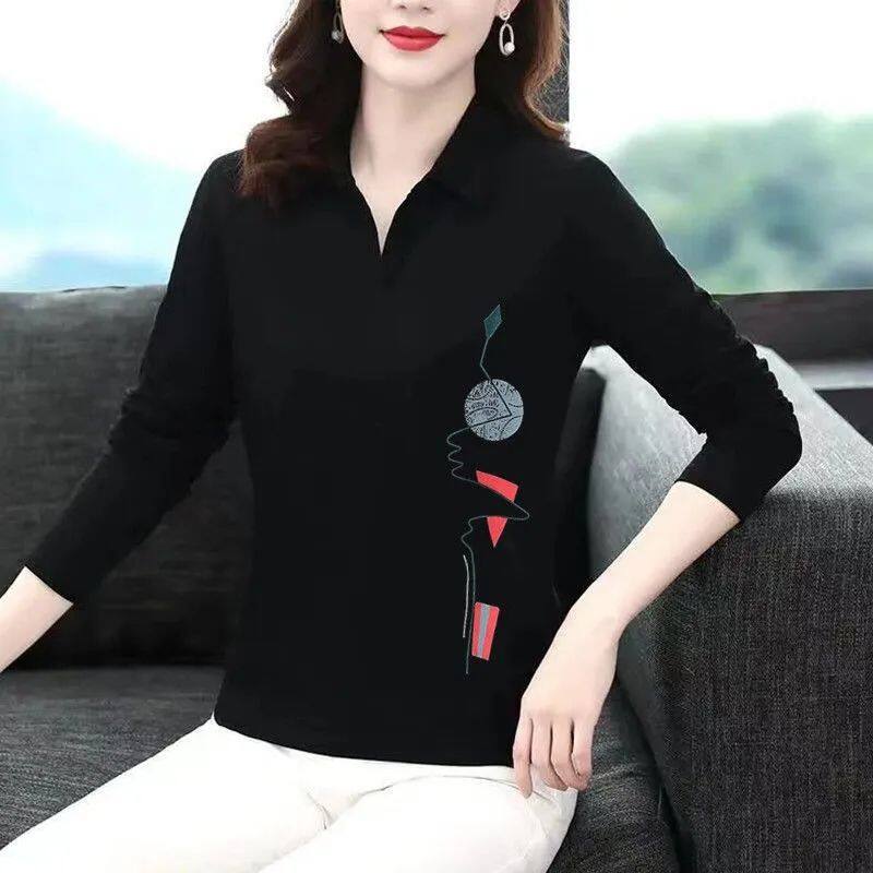Polo Shirt for Women Long-sleeved T-shirt for Women Spring Autumn New Temperament Lapel Top Printing Fashion Bottoming Shirt