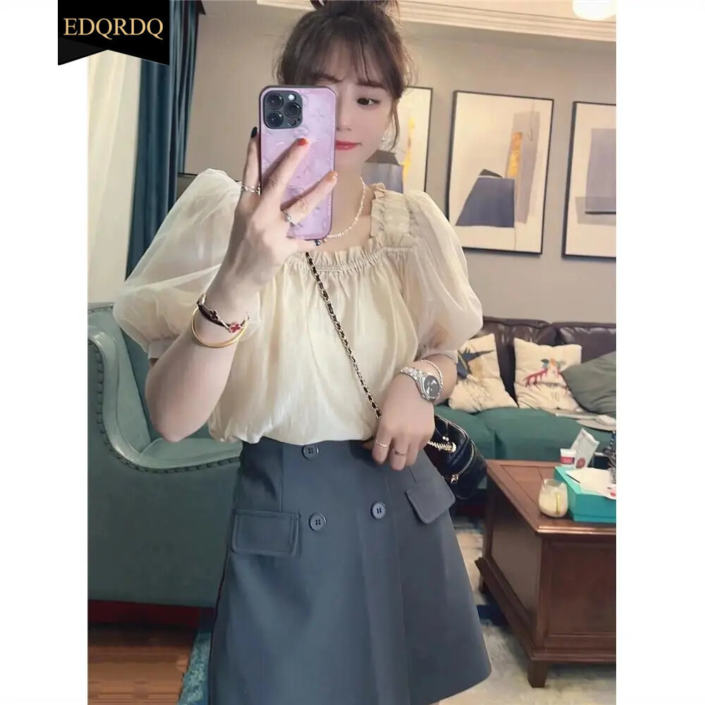 EDQRDQ Women's Mesh Sheer Ruched Tops Square Neck Puff Short Sleeve Off Shoulder Ruffle Volume Blouse Shirt