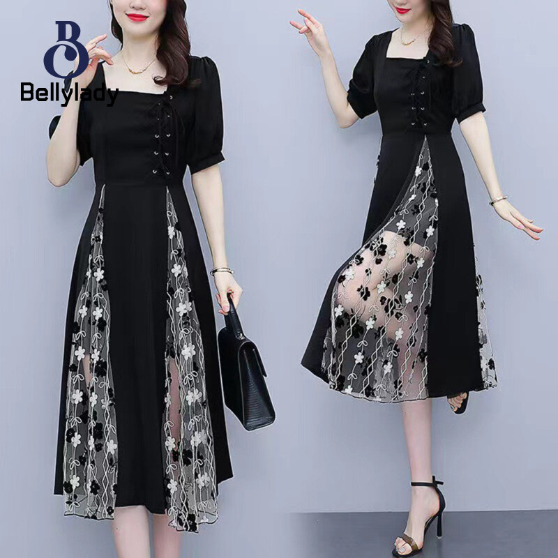 Women Square Collar Dress Large Size Lantern Sleeves Long Skirt Short Sleeves Mesh Dress