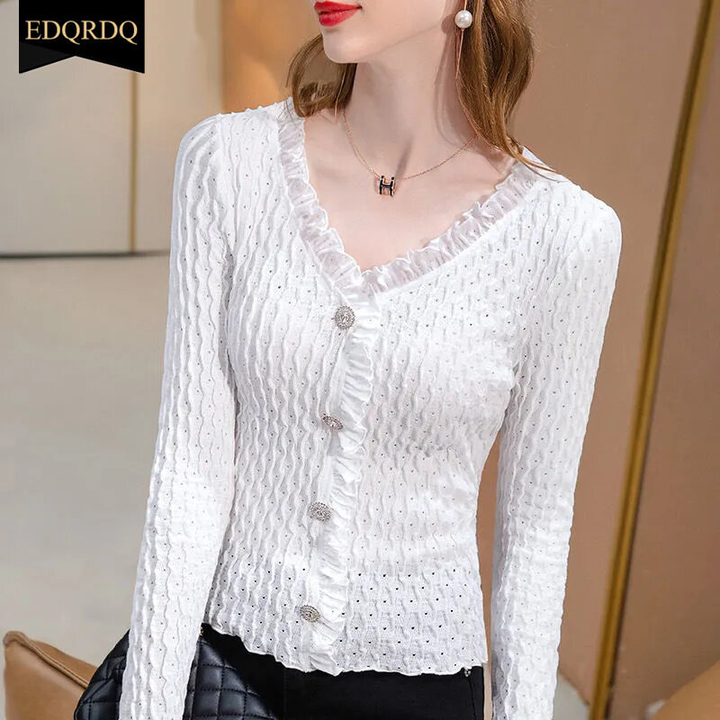 EDQRDQ Elegant Chiffon Tops Falbala Ruffles V Neck Button Blouses for Women