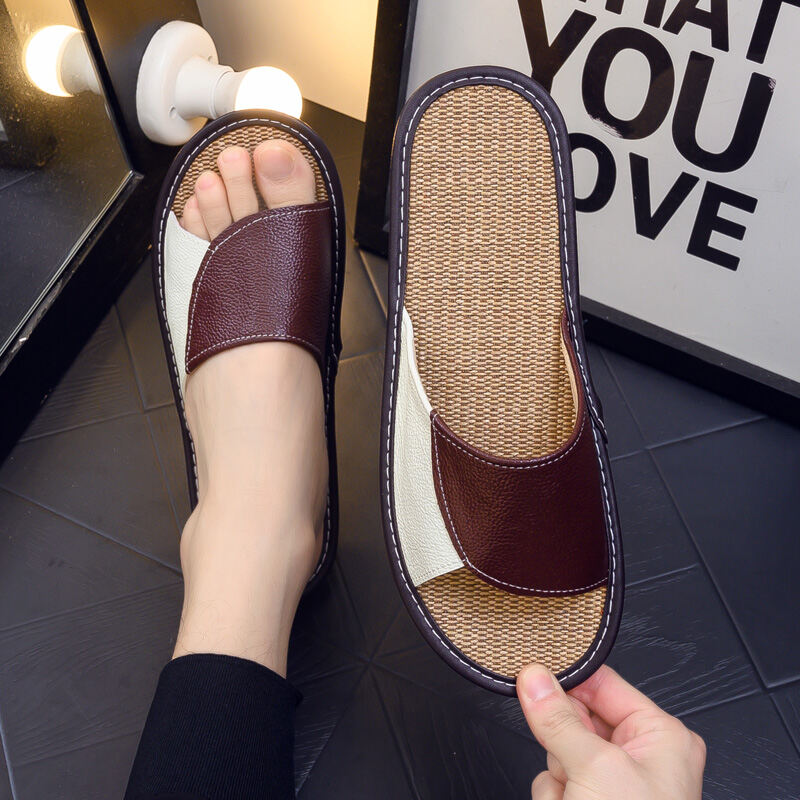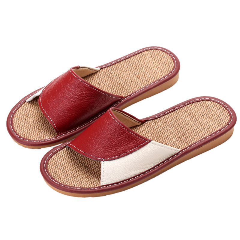 Summer Cowhide Leather Slippers Home Men's and Women's Four Seasons Indoor Floor Soft Bottom Non-Slip Linen Non-Stinky Feet