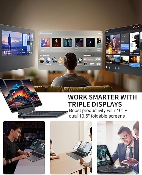 • Triple-screen immersion for work and play: This 16.6-inch triple-screen laptop with dual 10.5-inch foldable displays offers a wide range of multitasking settings, perfect for developers, video editors, financial traders, and gamers. Whether you're working on multiple projects, editing 4K footage, or playing your favorite open-world RPG, this triple-screen laptop provides the screen space and flexibility you need on the go.